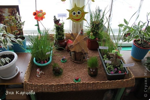 Попросила меня как-то воспитательница сына придумать и воплотить в жизнь поделку с тематикой "Огород" для выставки в детском саду. Ну я и развернулась :))) Моим недавним стало увлечение плетение из газетных трубочек (до этого опыт был плетения всего двух корзинок). Я сплела плетень 80*90 см (ну да, чего мелочиться-то), сплела Мельницу, всё это долго грунтовала, морила морилкой, лачила, а также вырезала и разрисовала солнышко, налепила фигурок. Мама моя (она в детском саду медсестрой работает) и воспитательница сына помогли с посадками. И вот что у нас вышло: